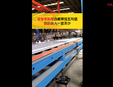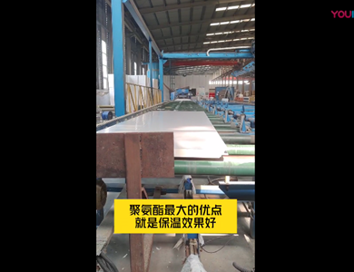 我們公司引進意大利賽浦連續(xù)生產線,采用了六組份在線工業(yè)微機自動操作(SIEMENS)混合澆注技術。生產流程分為開卷覆膜—壓制成型—鋼板預熱—高壓發(fā)泡—高溫固化—鋸切—板材冷卻—碼垛—自動打包等功能與一體的自動化生產線,年生產能力為130萬平方米。
